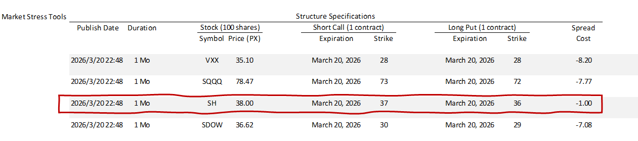 At expiration on March 20, 2026, the market declined further, and the inverse ETF used to express the bearish view (SH) moved beyond the target range.
